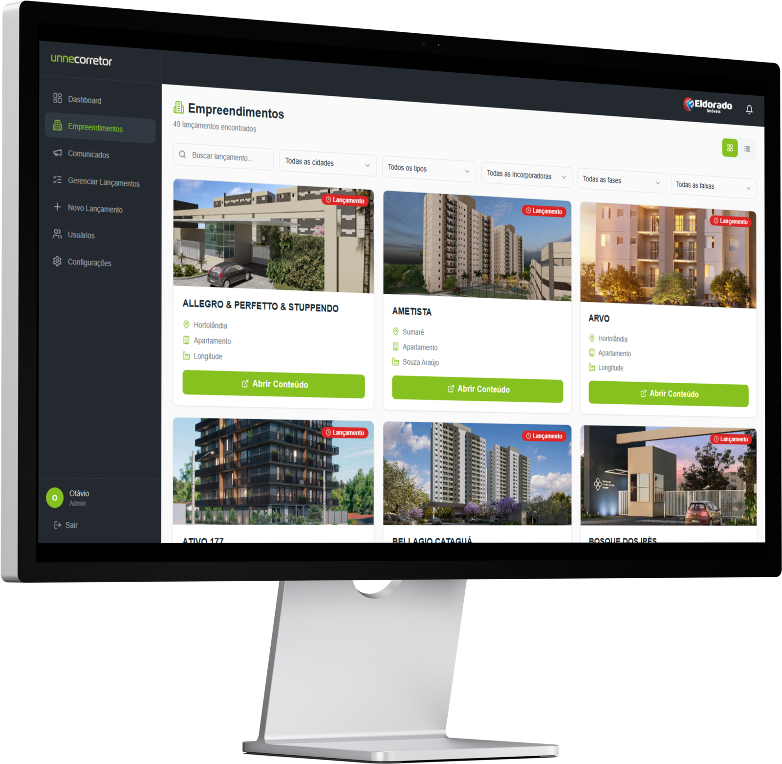 Uma plataforma simples que organiza todos os empreendimentos e seus materiais em um único lugar, facilitando o acesso às informações e a comunicação direta com os corretores.